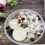 Mixed lettuce, tomatoes, cucumbers, red onions, kalamata olives and feta cheese.